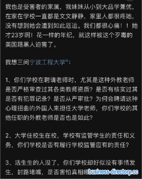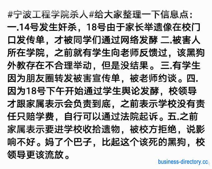 一- .14号发生奸杀,18号由于家长举遗像在校门口发传单,才被同学们通过网络发酵二.被害人所在学院,之前就有学生向老师反馈过,该黑狗外教存在不合理举动,但是没结果。三.有学生因为朋友圈转发被害宣传单,被老师约谈。四.因为18号下午开始通过学生舆论发酵,校领导才跟家属表示会负责到底,之前表示学校没有责任只赔学费,自行可以通过法院起诉。五.之前家属表示要进学校收拾遗物,被校方拒绝,说影响不好。妈了个巴子,比起这个该死的黑狗,校领导更该流放。